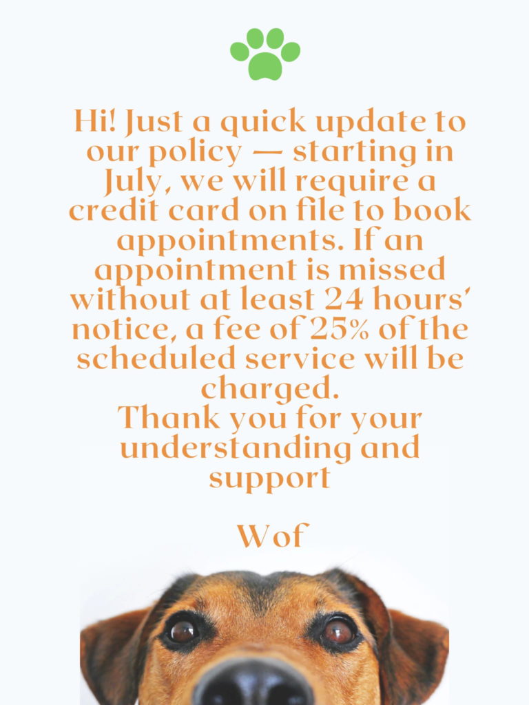 Please let us know before the appointment of any temperament or health issues your pet may have. This helps us provide the best possible service for your pet!